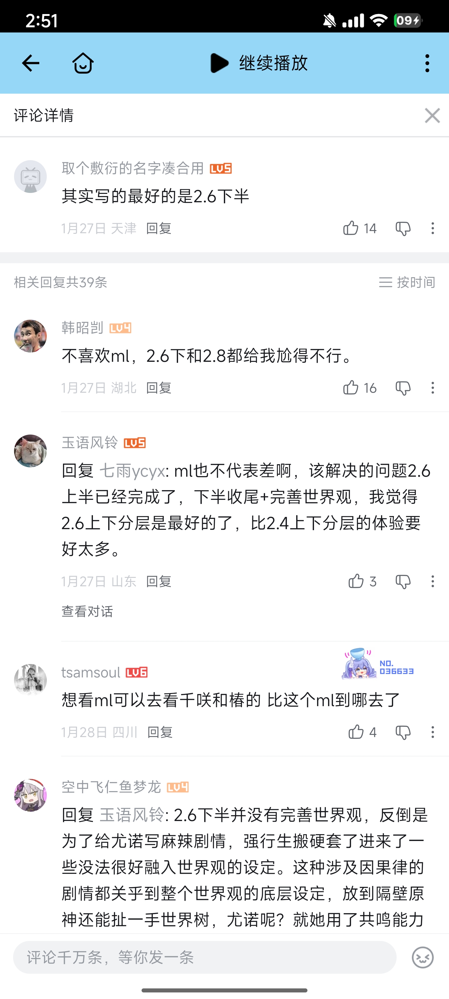 氪可救非 黎塞留主教◆回复:你喜欢尤诺玩2.6下就会很舒服,因为节奏确实很舒缓而且还引入了BGM和战斗同频的概念,这玩意目前只在3.1复刻了。不过2.6下做为主线章整体不出色也是实话。 但这些章都是在鸣潮内部比的,哪怕是最差的2.0放到外面也是碾压的