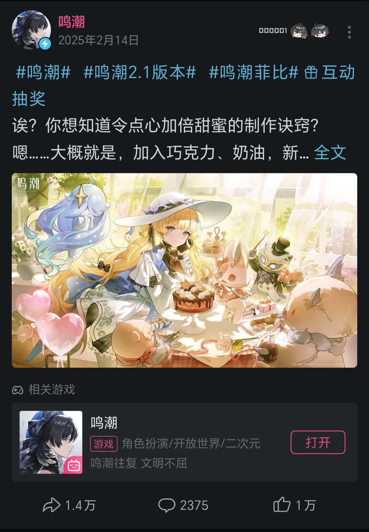 原神内鬼吧 明天就是老婆党和女儿党的决战了tid:104848991522026/02/13 14:25:57262179 1 9 0楼主:lijiaasdfghjkl 无情烧鹅最后回复:萌德无双2026/02/13 23:03:031楼pid:1531968003442026/02/13 14:25:57lijiaasdfghjkl无情烧鹅 楼主 8级 明天情人节,库洛会发爱弥斯和漂子的贺图吗2楼2条pid:1531968059072026/02/13 14:27:49明明如月yyds绯月之歌8级 老婆党就得杀,明天肯定没有爱弥斯,对着女儿叫老婆的我不好说是什么心理天之麻救不了川8级 想叫什么就是什么,这么多属性随便挑一个叫,别碍着别人就行ndj7411级 死串子3楼pid:1531968175082026/02/13 14:31:50元classd渊class7级 你想多了不会发的,就是要两个群体打起来才有热度4楼pid:1531968193382026/02/13 14:32:28御坂06723御坂美琴11级 肯定是守岸人啊5楼pid:1531968461512026/02/13 14:41:43痞子瞎吼冤英语十级💫1级 肯定两头恰想定性早就定了6楼pid:1531968499232026/02/13 14:43:03魏王1夏侯维特揯斯坦3级 莫宁和大针筒7楼pid:1531968551392026/02/13 14:44:55主公饶命非洲冰符号5级 当然是化身夏亚。8楼5条pid:1531968670472026/02/13 14:49:05被野狗咬了咋办1级 刚来 船锚是ml还是菲比是ml 牢库好像不过外国的情人节啊御坂06723 御坂美琴11级 端水了,男玩家是船长,女玩家是菲比被野狗咬了咋办 层主 1级 回复 御坂美琴 :那明天就是庸医和小爱了御坂06723 御坂美琴11级 回复 被野狗咬了咋办 :我感觉你猜中了被野狗咬了咋办 层主 1级 回复 御坂美琴 :大概率吧 一般这种同人推图只会在角色up之后出 但去年2.14船还没up (2.1版本是2.13号开的) 牢库的端水我是服气的王王王haiquan 白之水1级 端水的话那肯定是小爱,陆赫斯了9楼1条pid:1531969721942026/02/13 15:24:56醍醐对话爱丽丝图书会♤1级 怎么没有奶奶党天之麻救不了川8级 你这家伙,到底在说什么10楼pid:1531969902182026/02/13 15:31:14温彪sir第二实例11级 千万别发,那不是让麻辣野狗蹬鼻子上脸吗?最好男的女的都发才行11楼pid:1531971774392026/02/13 16:33:22回眸难忘你1级 我是家人党12楼pid:1531971976042026/02/13 16:39:46天之麻救不了川8级 决战都来了,我真不行了,差点以为真的是什么生死存亡之战13楼pid:1531972120832026/02/13 16:44:22溜达溜达略略略略略😠11级 14楼pid:1531972368502026/02/13 16:52:07太萧11级 今夕 长离 守岸人 椿 柯莱塔 坎特雷拉 卡提西亚,尤诺. 莫宁∶明明是我先来的15楼pid:1531972743192026/02/13 17:03:27MHYCHsqj盄薅轖鷥的小号13级 答案是大针筒16楼pid:1531974223952026/02/13 17:53:14lmyaoya银い钢管星辰帆舟1级 女漂过的剧情包妈妈党的17楼pid:1531977599342026/02/13 19:49:35别杀我时代5级 大概是端水的,陆和爱都发,社区这一块18楼pid:1531977796232026/02/13 19:56:20芙芙爱吃大香肠9级 闹麻节奏,都是米哈游干的19楼pid:1531983787512026/02/13 23:03:03萌德无双9级 妈妈党大声说话