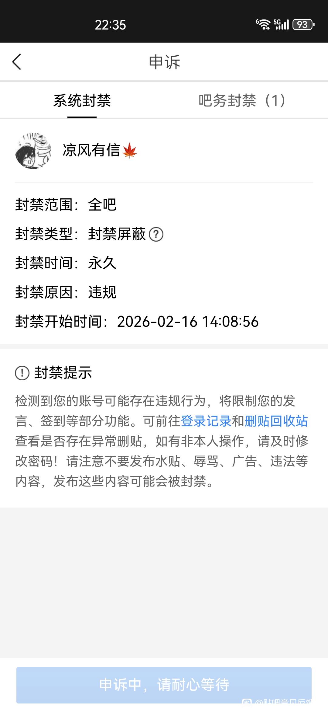 贴吧意见反馈吧 违规内容是怎么判定的tid:104856620842026/02/13 20:48:2210466 4 0楼主:小禾Yf最后回复:彼得帕刻的耶跌贴吧用户_GSJ71622026/02/17 22:58:351楼pid:1531979338842026/02/13 20:48:22小禾Yf 楼主 2级 2楼1条pid:1531984594452026/02/13 23:26:06行路者81815级 不知道~行路者818 层主 15级 关注~3楼3条pid:1531984606512026/02/13 23:26:27行路者81815级 好像没有人予以说明~小禾Yf 楼主 2级 哦,谢谢行路者818 层主 15级 回复 行路者818 :5楼1条pid:1532053003162026/02/16 00:04:51我爱天使0000徽宗舒º6级 没个具体的标准行路者81815级 8楼pid:1532112444032026/02/17 22:58:35彼得帕刻的耶跌彼得帕刻的亲叠2级 莫名其妙就给我封禁了