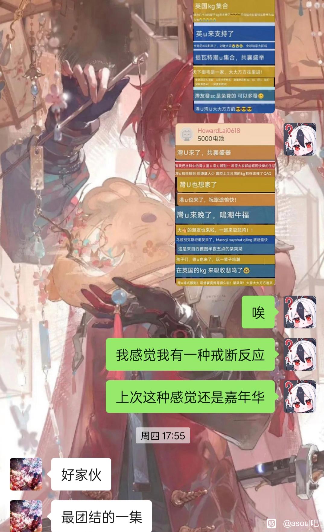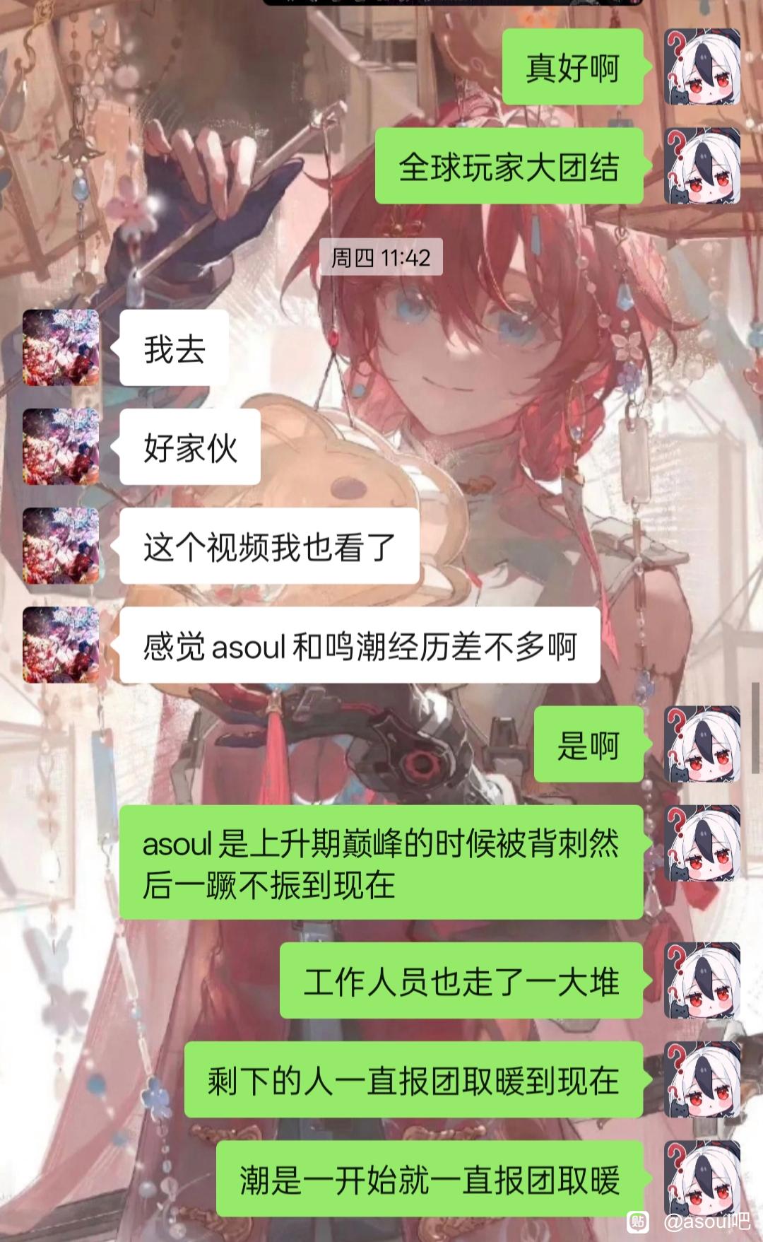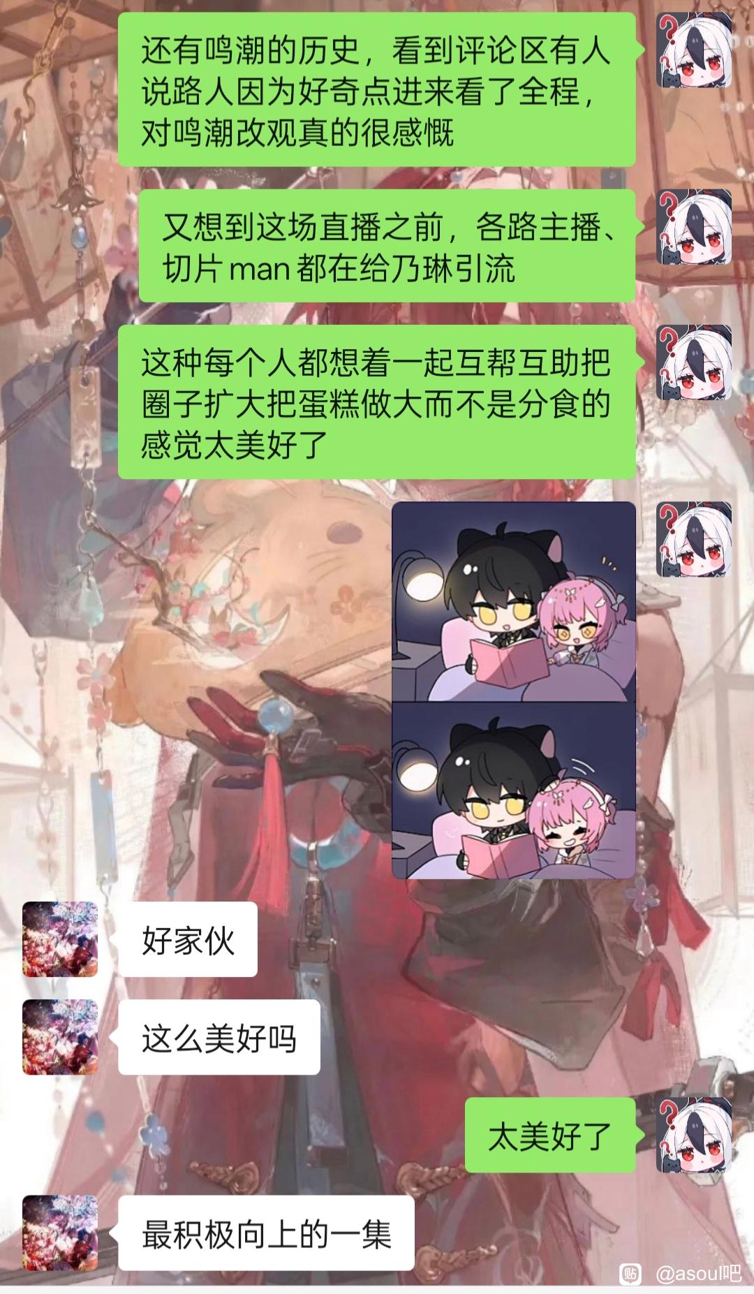 之后就是在乃琳开播前一直刷着帖子,所以也是简单认识到了au们的心路历程,同时也加深了对asoul各位的了解,当时的想法还只是看一看au这个鸣潮以来首次真正有着良好建交的群体(之前说是鸣潮和谁谁一个战线,在我心里其实只是因为节奏不得不联合起来、随时都有可能突然被拆散的东西)