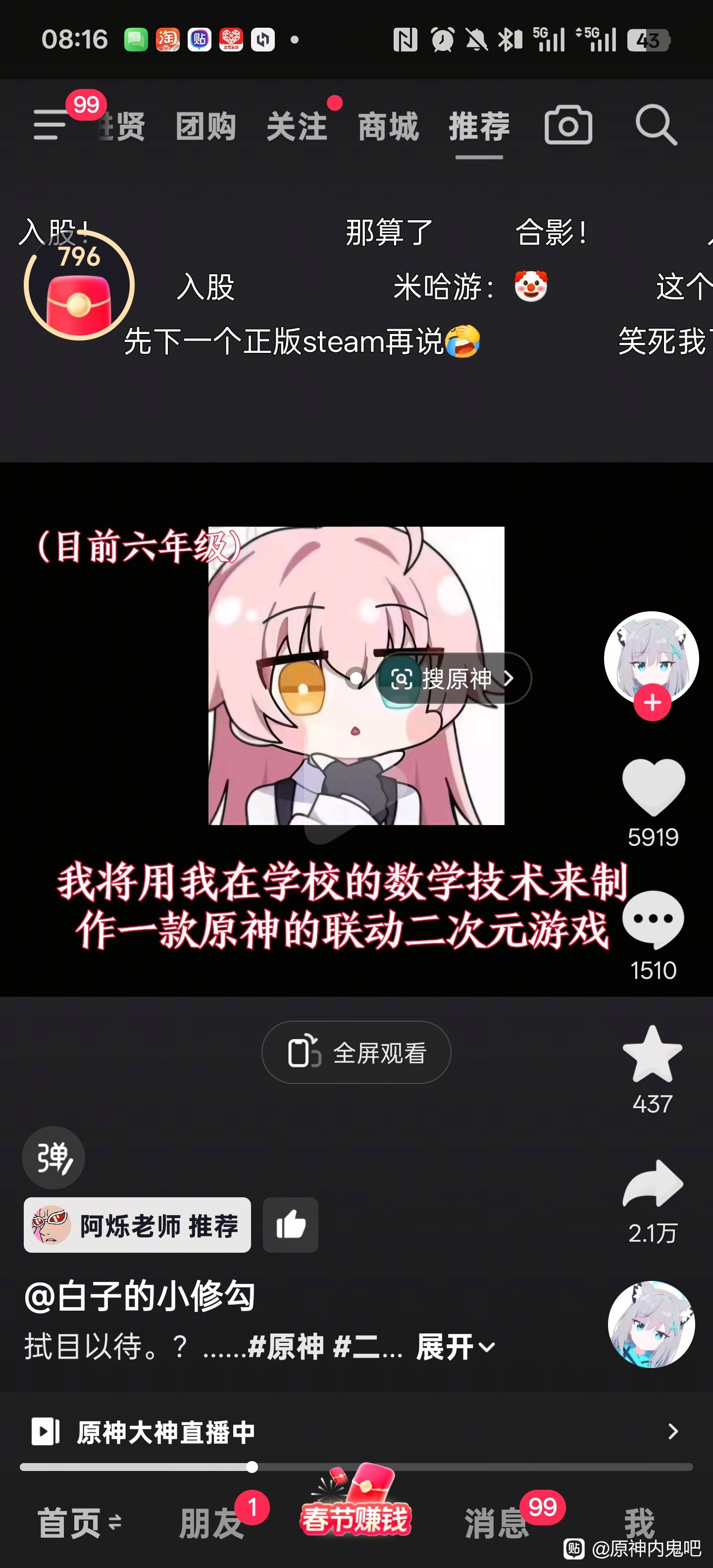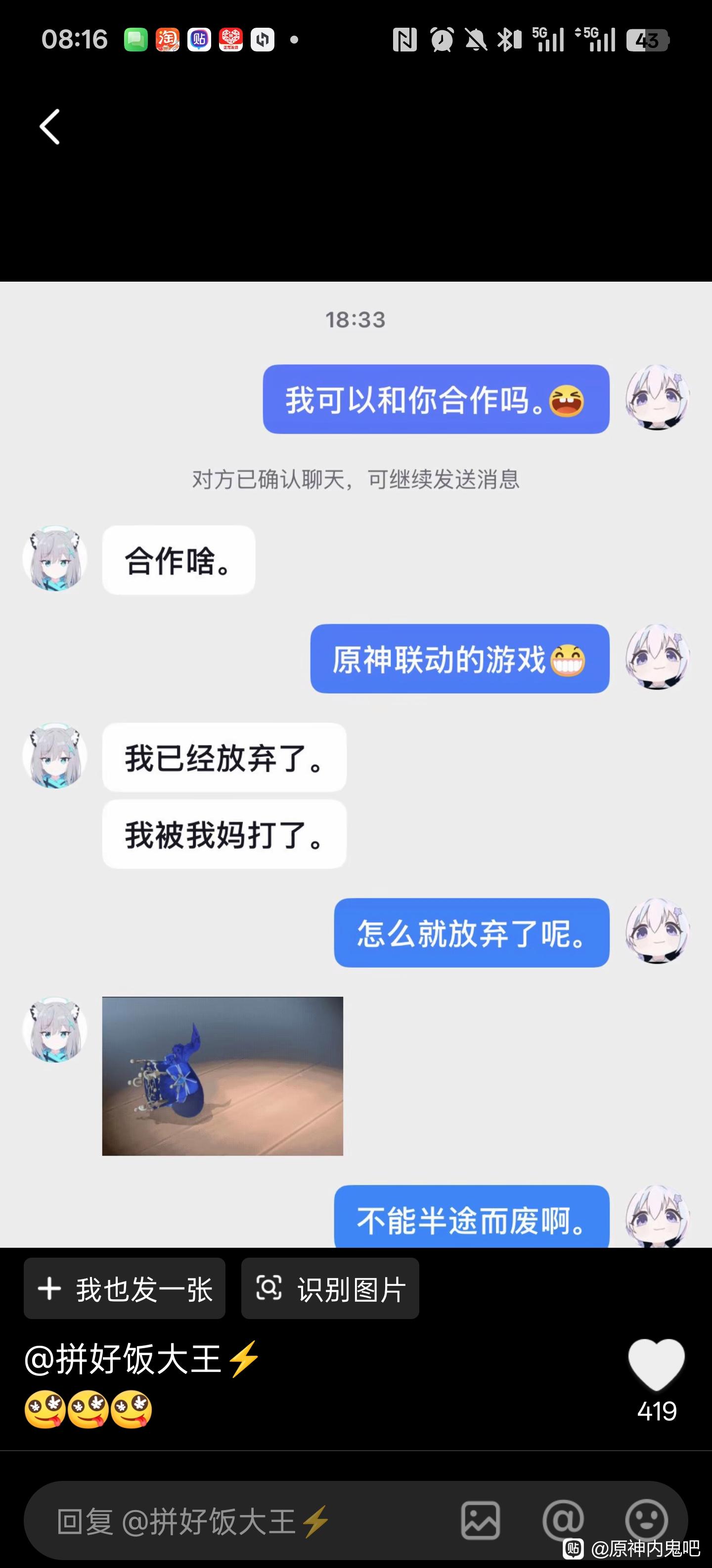 1楼pid:1531992594322026/02/14 08:17:362020yhq 楼主 5级 要购买米哈游的角色使用权来做游戏,结果评论区有张聊天记录,能绷住的是神人了,老米对小孩子的荼毒有点深了
