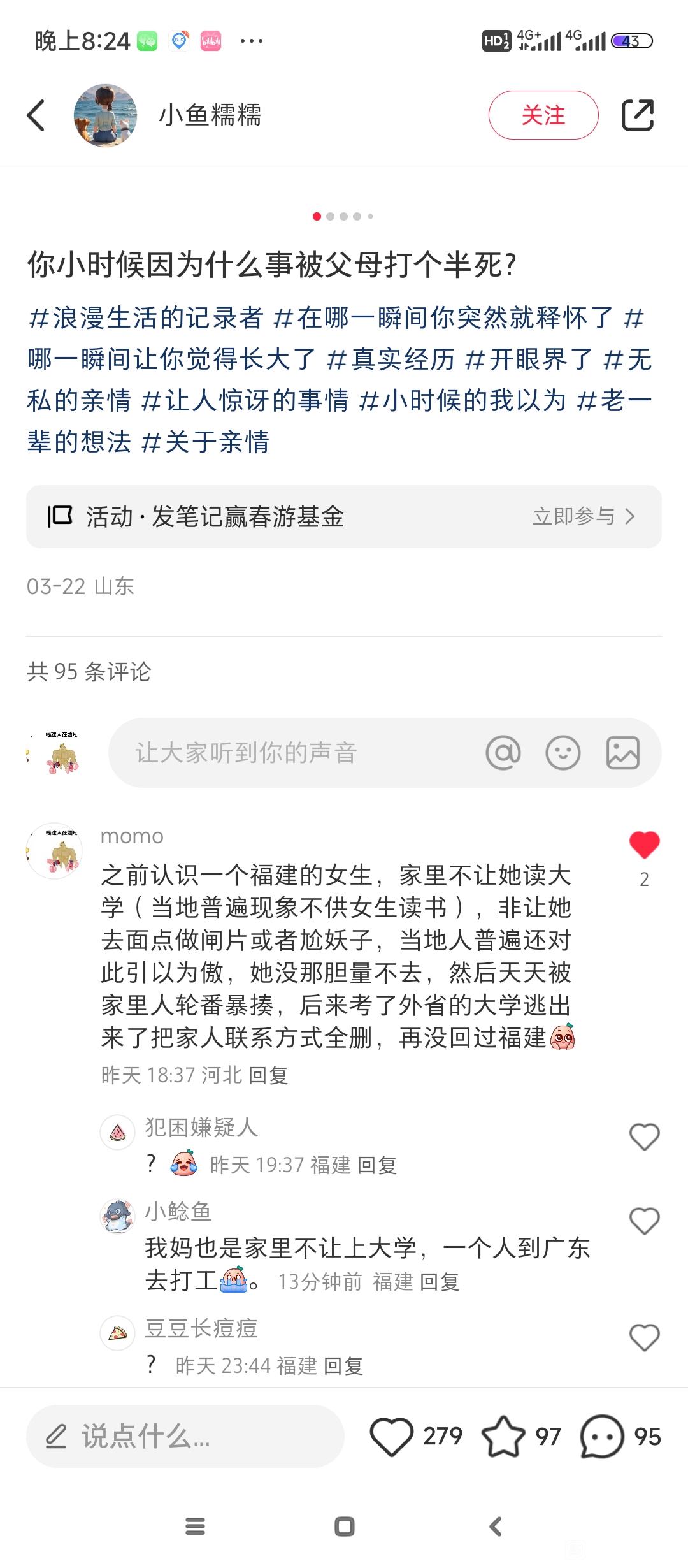 想起之前班里一个福建的女生,整个大学期间连哄带忽悠处了十几任男朋友,家里重男轻女(福建普遍现象不供女孩读书)不给一分💰,大学四年全靠男友包养,玩腻了就换下一个,当然代价大家也都懂得……堂而皇之的说女生要利用自己的优势,不用自己身体换取利益太可惜了。
