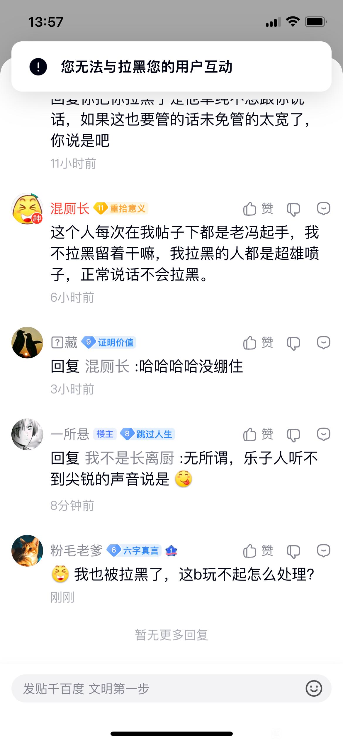 5楼8条pid:1532086557752026/02/17 01:27:43芙芙睡大爸上我不是长离厨小吧12级 他拉黑你之后有在你帖子下面留言吗?一所悬 楼主 8级 没在我贴子留过言芙芙睡大爸上 我不是长离厨 层主 小吧12级 回复 一所悬 :他是之前跟你对线到一半的时候拉黑你的吗一所悬 楼主 8级 回复 我不是长离厨 :不知道,我今天看他发帖想回一下才发现芙芙睡大爸上 我不是长离厨 层主 小吧12级 回复 一所悬 :那这样其实是不算一击脱离的, 跟你对线到一半把你拉黑了叫🐢,没回复你把你拉黑了是他单纯不想跟你说话,如果这也要管的话未免管的太宽了,你说是吧混厕长11级 这个人每次在我帖子下都是老冯起手,我不拉黑留着干嘛,我拉黑的人都是超雄喷子,正常说话不会拉黑。孤寡孤的海角 𠱽藏9级 回复 混厕长 :哈哈哈哈没绷住一所悬 楼主 8级 回复 我不是长离厨 :是我没回复他,也可能是一击脱离了但我这次才发现,随便吧,反正拉黑那一刻他已经是个笑话了回复 我不是长离厨 :无所谓,乐子人听不到尖锐的声音说是粉毛老爹6级 我也被拉黑了,这b玩不起怎么处理?