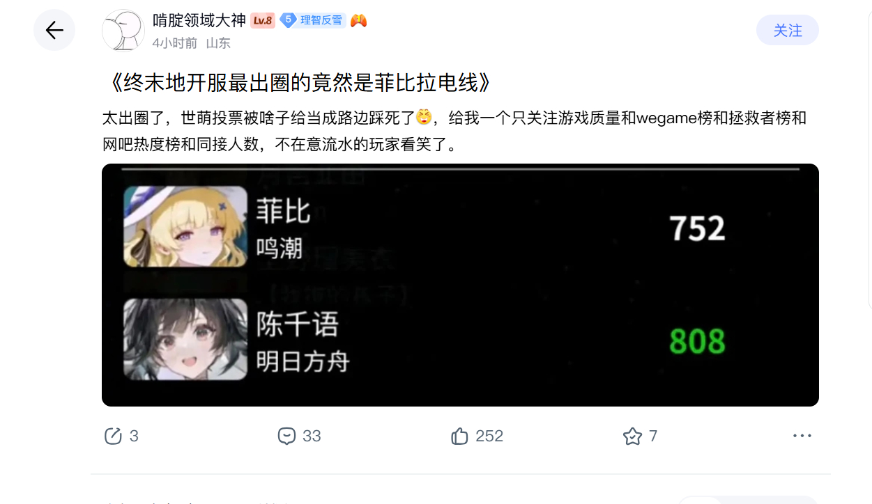 asoul吧 《终末地开服最出圈的竟然是菲比拉电线》tid:104989399092026/02/19 12:50:4912471 2 0楼主:孙笑川12309 12岁已觉醒最后回复:.Ruler.2026/02/19 14:19:461楼pid:1532157641352026/02/19 12:50:49孙笑川1230912岁已觉醒 楼主 8级 太出圈了,世萌投票被啥子给当成路边踩死了,给我一个只关注游戏质量和wegame榜和拯救者榜和网吧热度榜和同接人数,不在意流水的玩家看笑了。2楼pid:1532157690182026/02/19 12:52:32孙笑川1230912岁已觉醒 楼主 8级 参考文献3楼pid:1532157738612026/02/19 12:54:17Augustus897爱尔奎特布伦史塔德18级 偷晚了4楼pid:1532157795302026/02/19 12:56:23写作之夜waw😋😅😅🤗😋8级 神了5楼pid:1532157835702026/02/19 12:57:54星梦缘行8级 今年怎么b站都没人炒这个世萌,刷都没刷到6楼pid:1532157898712026/02/19 13:00:18食人控7级 世萌不是死了几年了?这又是哪的冒名野鸡比赛7楼pid:1532157991242026/02/19 13:03:41青木楊菜青木陽菜.9级 偷晚了8楼pid:1532158119692026/02/19 13:08:06TXD落叶渐凉ing❄️透心凉真的菜9级 感觉不如b萌,去年卫宫大战五条悟是真的激烈吧还有女子组月丑保远坂凛9楼pid:1532158246212026/02/19 13:12:54已隐退了119级 偷晚了 小陈都被艾特爆了10楼pid:1532158287222026/02/19 13:14:29贴吧用户_GU85Vb88级 心宜发歌了?真的假的BV15HZYB8Em311楼pid:1532158945782026/02/19 13:39:07硬核不媚宅H狠狠滴媚宅6级 4000人投票的路边一条12楼pid:1532159879192026/02/19 14:15:23小非凡555🧂星见亚砂🧂9级 雪宝宝真是人均高能儿,去圆规吧发个投票都十倍杀这路边投票13楼pid:1532159990032026/02/19 14:19:46.Ruler.7级 放过他们吧,陈千语已经是zmd人气最高的角色之一了