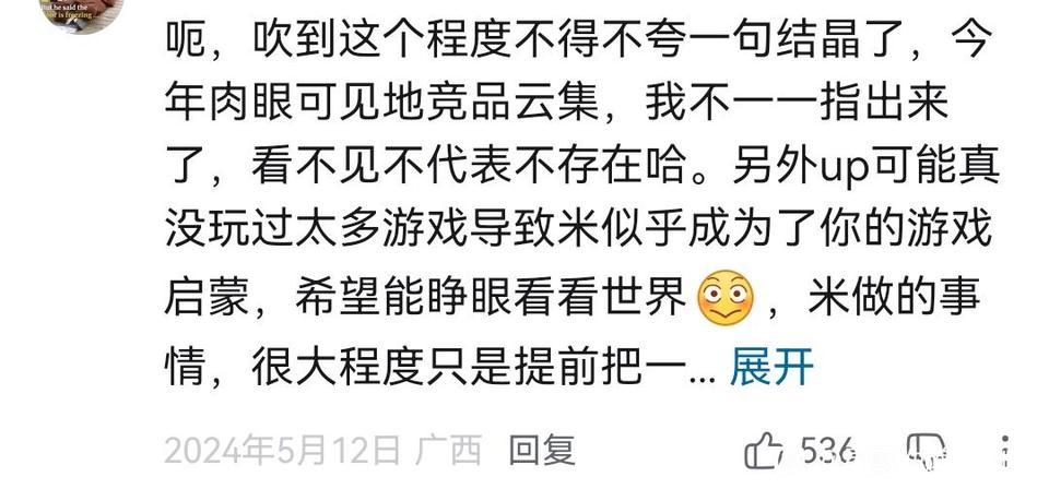 不管kg如何在未来游戏上线前就开始赢,如同当年的mxz一样,客观来说,后续几款二游都是有一战之力的。光一个最近的异环,在很多方面其实已经可以压着小鸣打,拭目以待吧