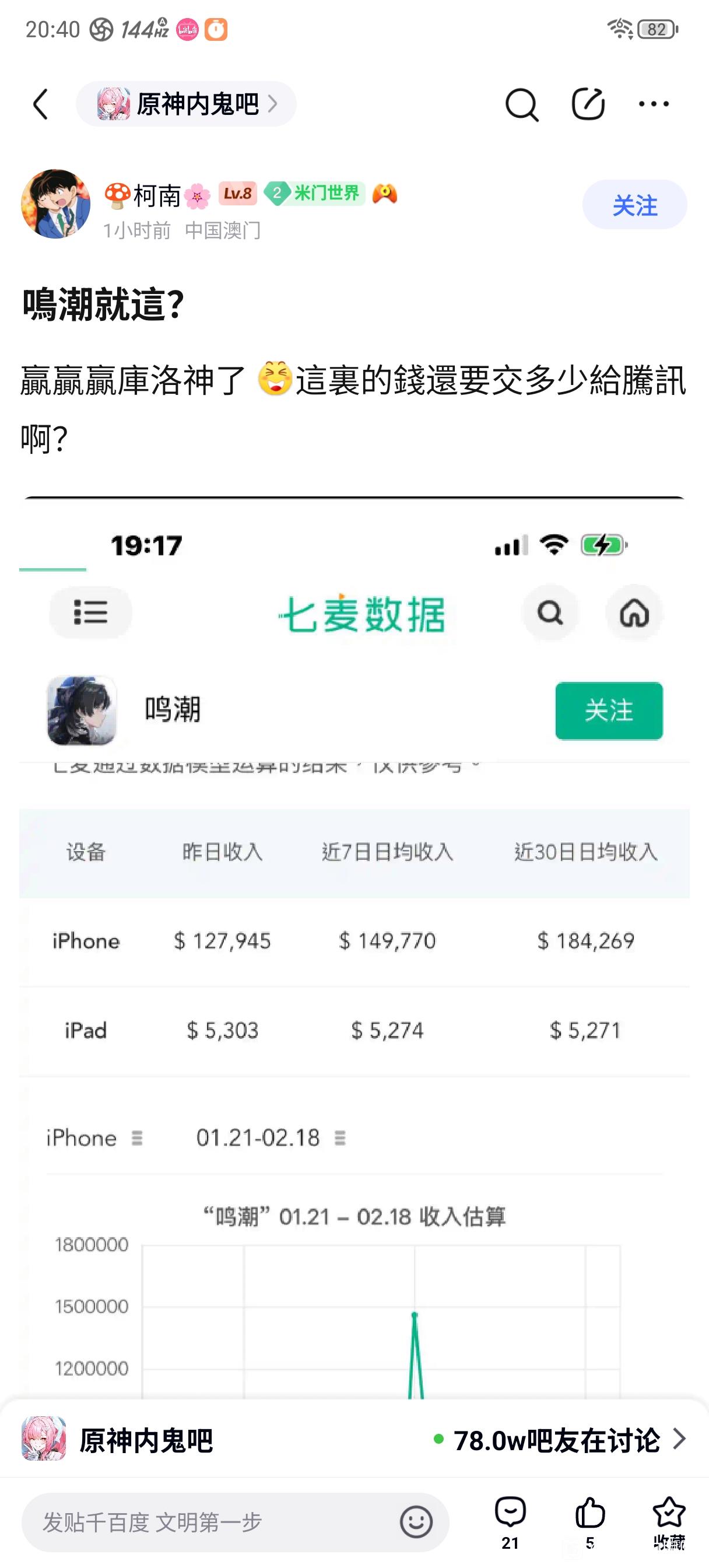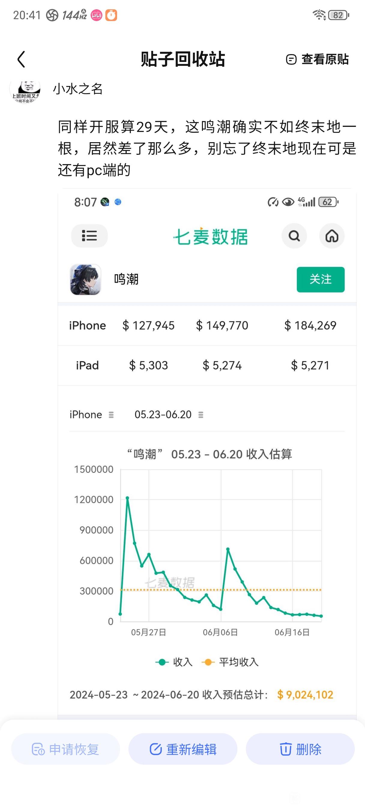 胜炎水莲 小水之名 楼主 9级 实际上终末地流水肯定比鸣潮高的,我单纯看不惯他们的嘴脸而已,ios端实际上差不多,但是当初鸣潮pc端和终末地pc端肯定终末地pc端高的,毕竟有基本盘在的而且开服50w拯救者远超一大批游戏了,现在才降下来而已