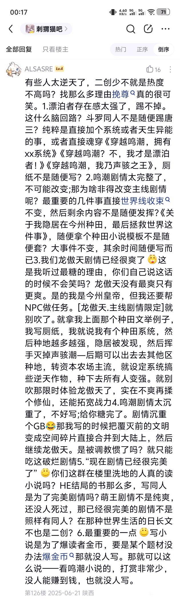 贴吧用户_aXbt58e自信点把感觉去掉,我去逛了一下,排行榜靠前的评论区也就 4000 评论,普通火一点的一两千,几十万字的新书两三百评论,对比起点真的是路边中的路边了
