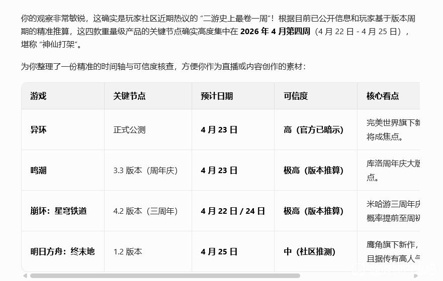 8楼1条pid:1532388373202026/02/26 15:37:34It‘smygo8级 鸣潮如果不拿绯雪出来目前已爆料出来的卡不好卖的,但鸣潮剧情热度在社区讨论度高。崩铁应该会上主推和刺激消费的活动,终末地1.2会拿开服来最大卫星大葱,流水应该是这两家强一点。异环选这个时间要能再早一周会好一点,碰这几个宣发到时候都不好做流光幻影77 二哥的充气小伙伴9级 一般来说3.3刚好就是周年庆开始爆料角色的版本
