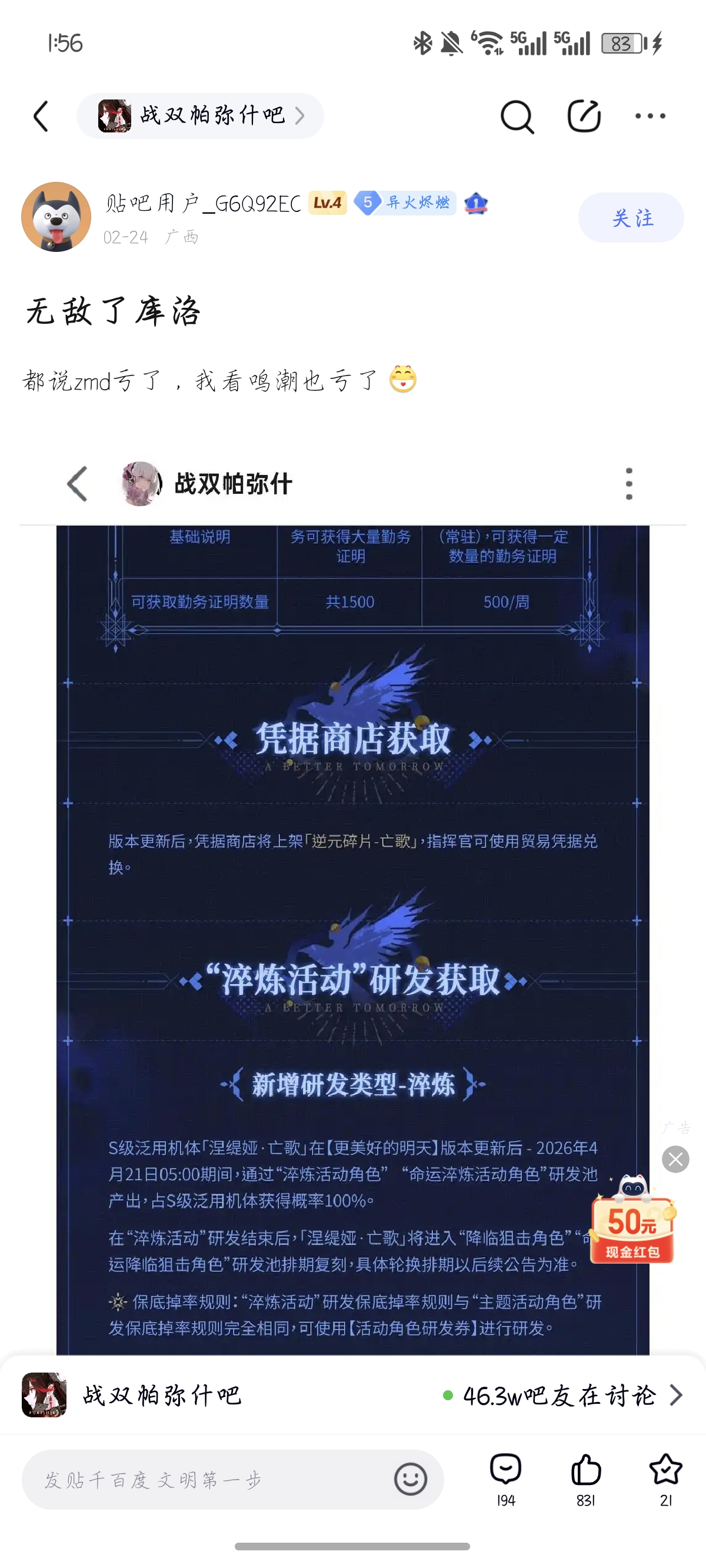 1楼pid:1532385427222026/02/26 14:04:58雨歇万物青 楼主 6级 绷不住一点,o神给崩铁输多少血?粥给终末地输多少血。米库鹰三家好像只有鸣潮是在反哺战双吧,你的意思是鸣潮亏完了要从战双身上吸血吗?有点子幽默在身上的,没鸣潮谁知道你战双?