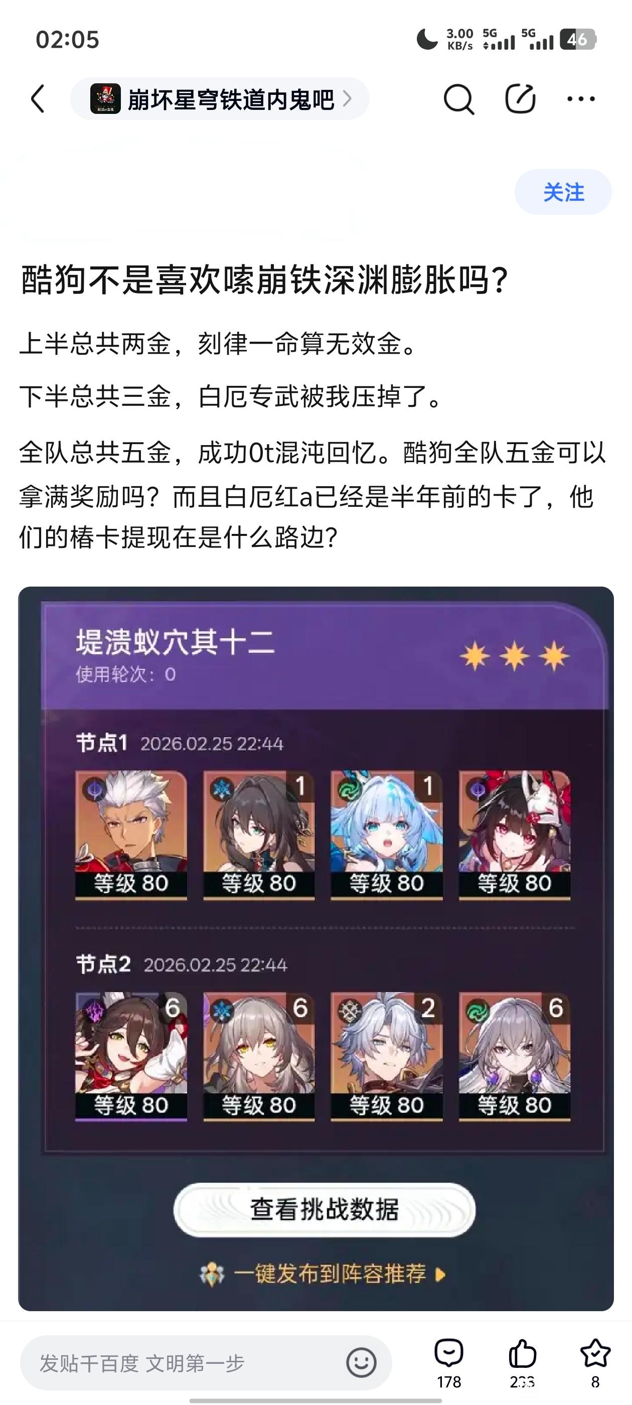 全队总共五金,成功0t混沌回忆。酷狗全队五金可以拿满奖励吗?而且白厄红a已经是半年前的卡了,他们的椿卡提现在是什么路边?
