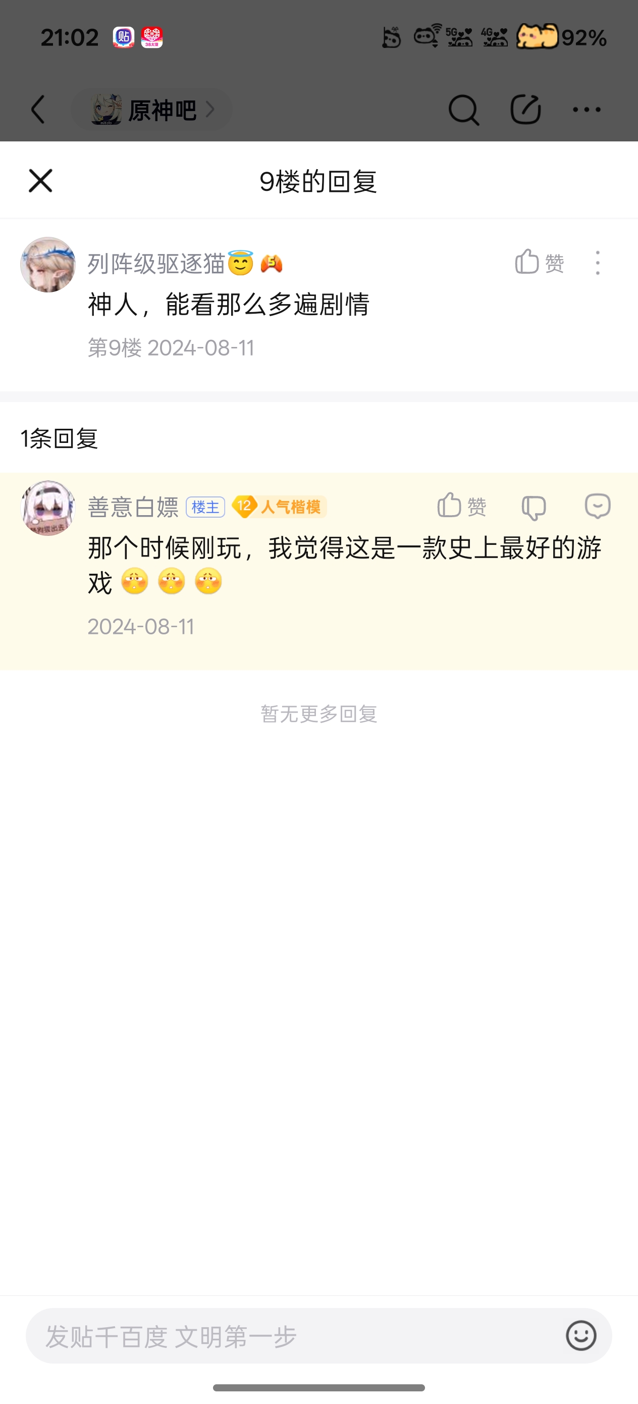 起始页原神内鬼吧 翻到当mxz的记录tid:105223219642026/02/28 21:03:157208 4 0楼主:镐艏 善意白嫖最后回复:vnya1234562026/02/28 22:18:271楼pid:1532471067182026/02/28 21:03:15镐艏善意白嫖 楼主 10级 666我以前原来是铁血米孝子3楼1条pid:1532471381892026/02/28 21:13:14御坂06723御坂美琴11级 用罗这句话与你共勉虽然公众人物说这话不对,但是对于普通人而言没啥大问题镐艏 善意白嫖 楼主 10级 4楼pid:1532473260442026/02/28 22:12:09ACCED芙卡洛斯不羡仙100346级 贡献清零5楼pid:1532473459922026/02/28 22:18:27vnya123456小人国神兽8级 说实话我是真的不知道你们怎么坚持下去的,刚开服那个跑图和过剧情的节奏就差点把我拖死,跳过也没有。玩到15级就跑路了