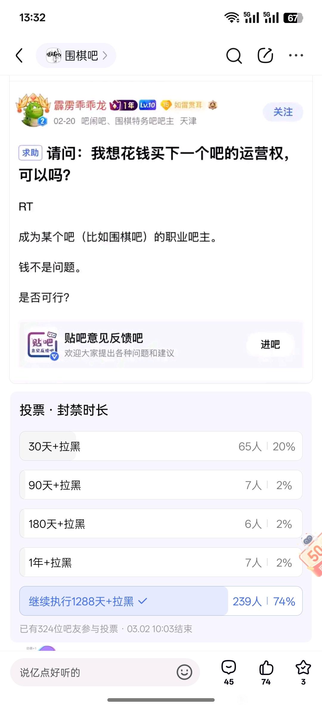 投诉围棋吧新任吧主刚上任就封禁合规的竞争者和其他吧友