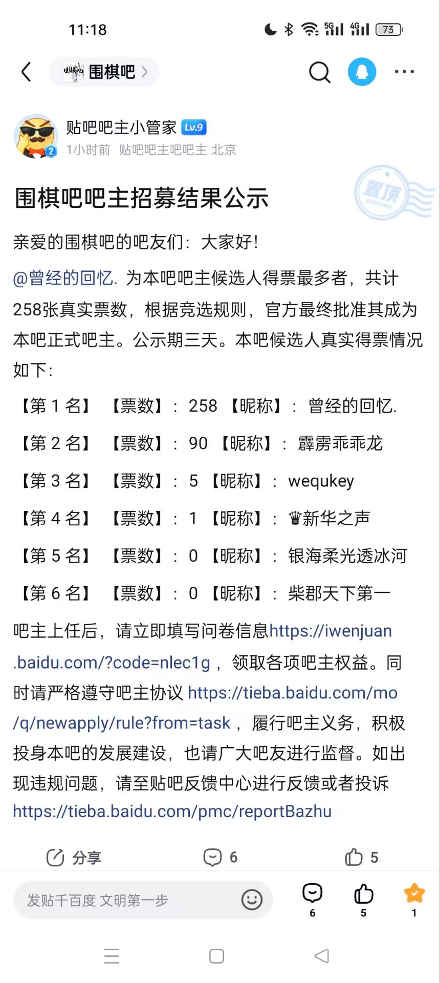 本人ID为“霹雳乖乖龙”,是2026年2月28日结束的、贴吧官方承认的、围棋吧吧主竞选的2号候选人,本人得票90张,位列候选人的第2位,证据如下:
