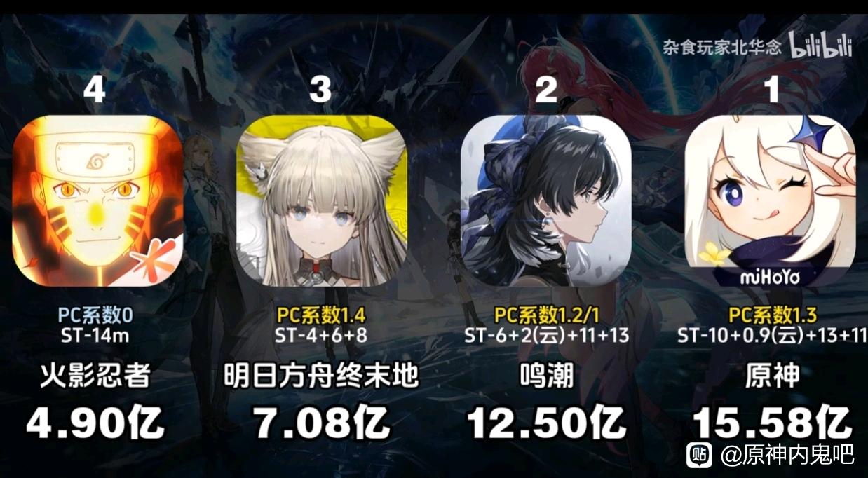 这么说吧,之前有个表ios鸣潮38万人,原神410万。前提是原神玩家是11倍鸣潮玩家基础上原神流水是鸣潮2.3倍。也就是1鸣=4.8原