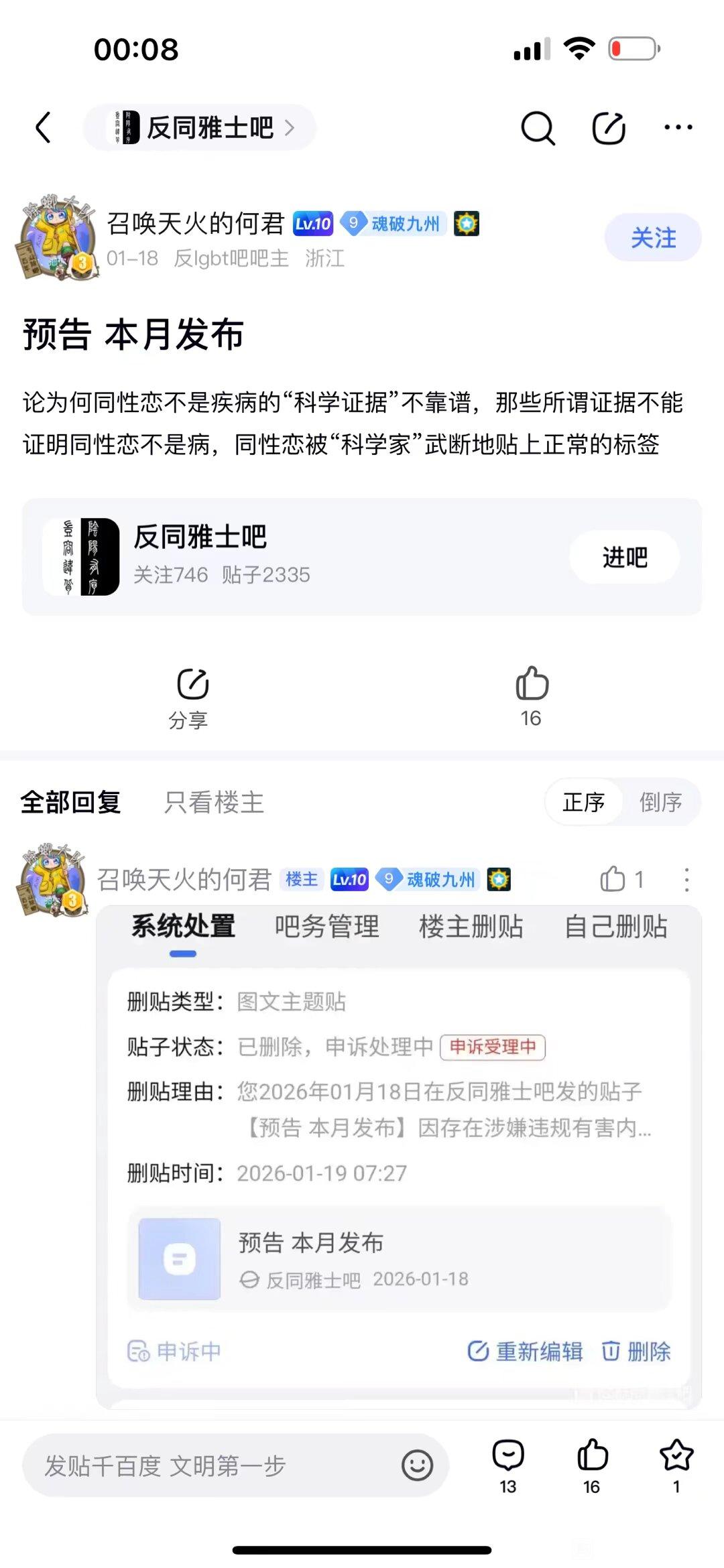 9楼4条pid:1532778576792026/03/09 17:03:35贴吧吧主小管家吧主12级 吧友您好,你提供的投诉材料已悉知,吧务组在核实基础投诉信息无误后,将递交给官方审查,请耐心等待。注:1. 最终处理结果以相关贴吧的吧主上任公告为准,吧务组不再另行通知;2. 若您提供的基础信息有误或自行删贴则视为自行撤销本次投诉,吧务组不再另行通知;3. 其他关于投诉贴的处置说明详见本吧顶部吧规明细。firesteel0 飞机是鸟不是机 楼主 4级 该竞选人在竞选期间严重作弊,切存在攻击吧友现象,望取消其竞选资格此人身为反同组织一员曾担任多个已被封禁的违规贴吧的吧务组,希望这次直接封禁其账号Phoenix艾琳 狮心王🌟1级 回复 飞机是鸟不是机 :你还好意思说啊,是谁用几个小号抢没抢成功的firesteel0 飞机是鸟不是机 楼主 4级 回复 狮心王🌟 :何君啊,lgbt退散吧是谁没拿到啊~