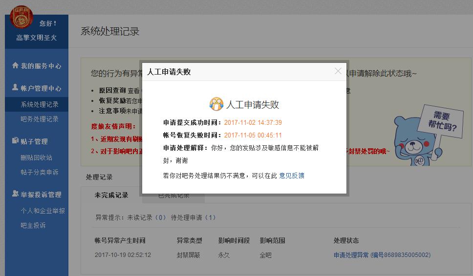 贴吧意见反馈吧 【申请解封】贴吧ID:高擎文明圣火tid:54550650402017/11/27 16:10:21142195 0 0楼主兼最后回复:张太岳33692026/01/31 12:40:551楼pid:1156831461592017/11/27 16:10:21张太岳3369 楼主 1级 申诉理由:尊敬的贴吧管理,该被封禁帐号并没有发布过涉及敏感信息的贴子,所有回复和发布都可查证,请管理查证之后给予解封。2楼3条pid:1156849716872017/11/27 17:02:38张太岳3369 楼主 1级 为何毫无道理地封禁贴吧超级会员???!!!张太岳3369 楼主 层主 1级 回复 张太岳3369 :回复 张太岳3369 :3楼pid:1161728755922017/12/14 23:03:55张太岳3369 楼主 1级 @高擎文明圣火4楼2条pid:1180375725662018/02/13 22:31:05张太岳3369 楼主 1级 鲁炜都被双开了,为何还不解封贴吧ID【高擎文明圣火】?!张太岳3369 楼主 层主 1级 6楼2条pid:1186879955682018/03/16 23:03:00张太岳3369 楼主 1级 该账号没有使用不雅或不恰当的ID和昵称。从事非法商业活动。该账号没有模仿贴吧管理人员ID或者用他人ID,用以假冒管理人员或破坏管理人员形象。该账号没有使用发帖机等非法软件进行爆吧、违法发贴的行为。如果该账号出现了违反百度贴吧的使用规则,并非其本人使用,一定是其他人盗用该账号,希望官方能够为该账号解封,该账号会及时修改密码,并且妥善处理,该账号不会让不和谐的东西干扰贴吧环境,请务必为该贴吧账号解封,因为该账号十分热爱这个平台——百度贴吧!张太岳3369 楼主 层主 1级 @贴吧监控 @贴吧Madam @贴吧阿Sir9楼pid:1460497653822022/11/08 14:32:21张太岳3369 楼主 1级 😡10楼pid:1460829145572022/11/11 23:36:21元气小福袋x夏木🇨🇳9级 至今没给处理,白搭啦!11楼pid:1531486423122026/01/31 12:40:55张太岳3369 楼主 1级