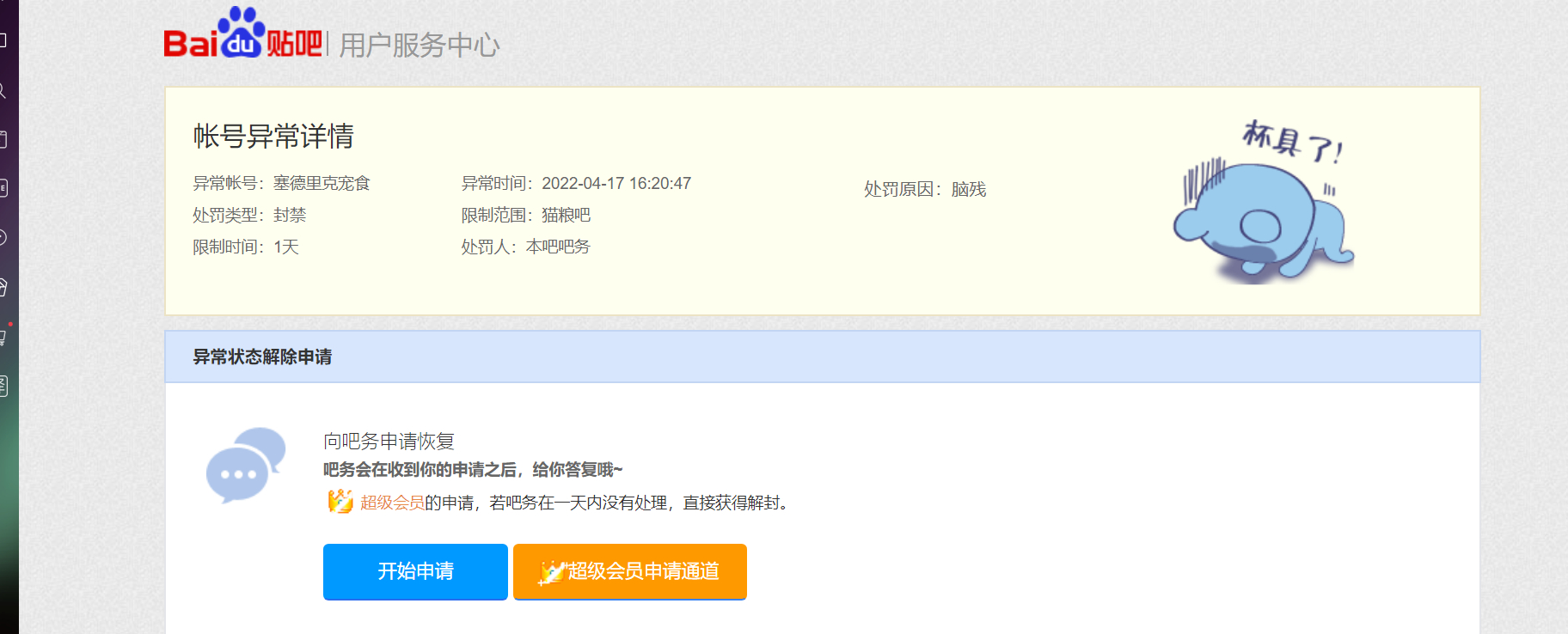 申请理由:无吧主,无吧务,长期发布违规内容