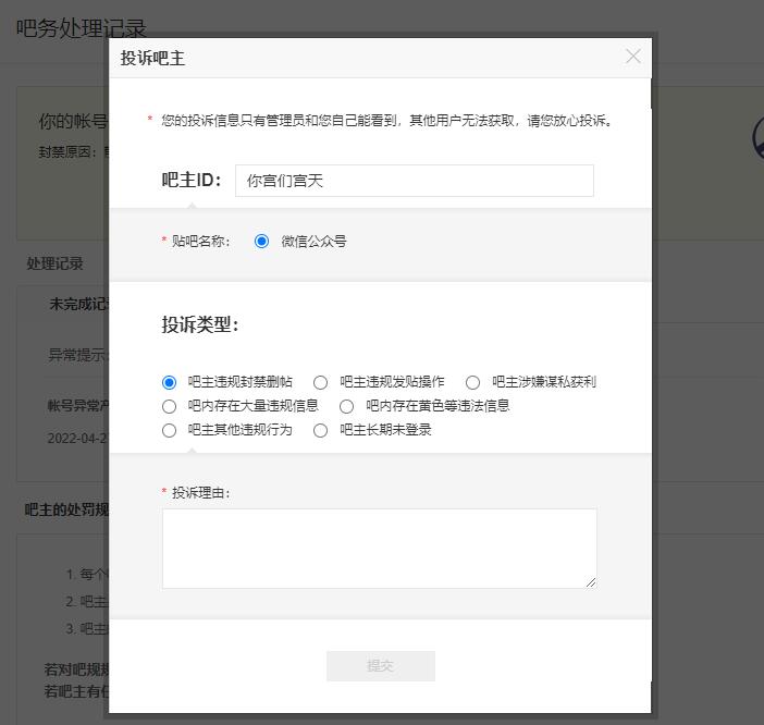还有,老子单独投诉个人还不行?点个“举报”跳出来的变成投诉吧主?老子投诉个人,跟吧主什么关系,逻辑上不是应该能够随时找到吧主投诉个人?还有,在个人主要就不能投诉个人?非得发了帖子才能投诉?就好比你家里来了一堆骗子强盗,我有他们的犯罪记录,但现场他们没犯罪,当场就不能投诉报警抓他们了?耻笑天下的百度贴吧,搞这么烂还不如撤了,你们已经被别人甩了几条街知道?