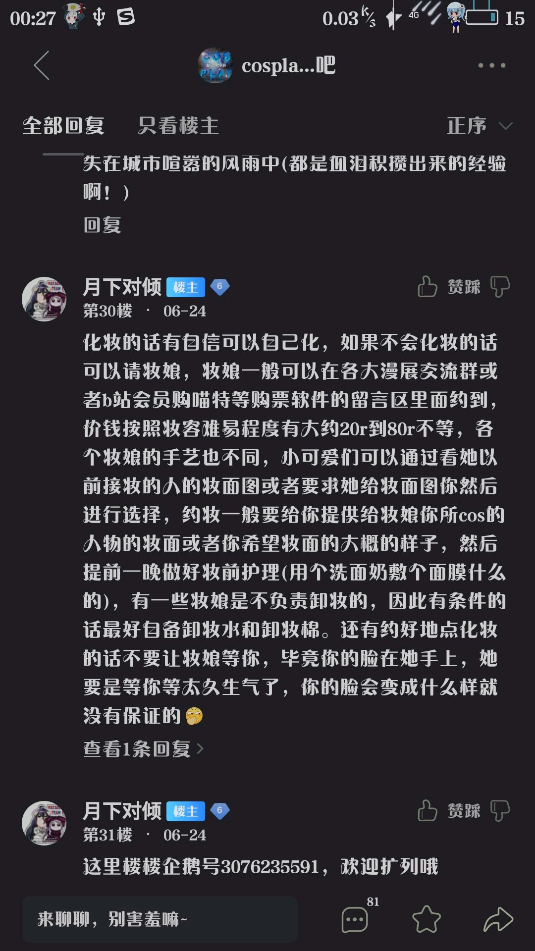 化妆的话有自信可以自己化,如果不会化妆的话可以请妆娘,妆娘一般可以在各大漫展交流群或者b站会员购喵特等购票软件的留言区里面约到,价钱按照妆容难易程度有大约20r到80r不等,各个妆娘的手艺也不同,小可爱们可以通过看她以前接妆的人的妆面图或者要求她给妆面图你然后进行选择,约妆一般要给你提供给妆娘你所cos的人物的妆面或者你希望妆面的大概的样子,然后提前一晚做好妆前护理(用个洗面奶敷个面膜什么的),有一些妆娘是不负责卸妆的,因此有条件的话最好自备卸妆水和卸妆棉。还有约好地点化妆的话不要让妆娘等你,毕竟你的脸在她手上,她要是等你等太久生气了,你的脸会变成什么样就没有保证的