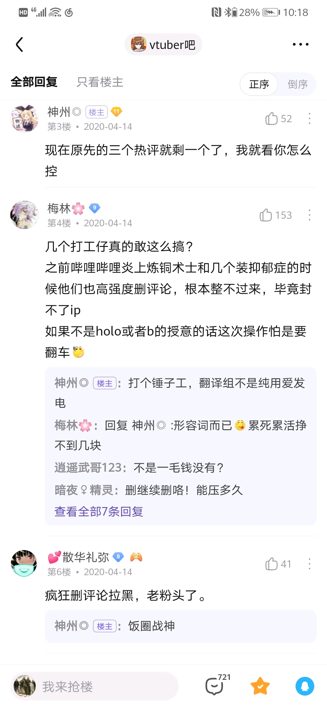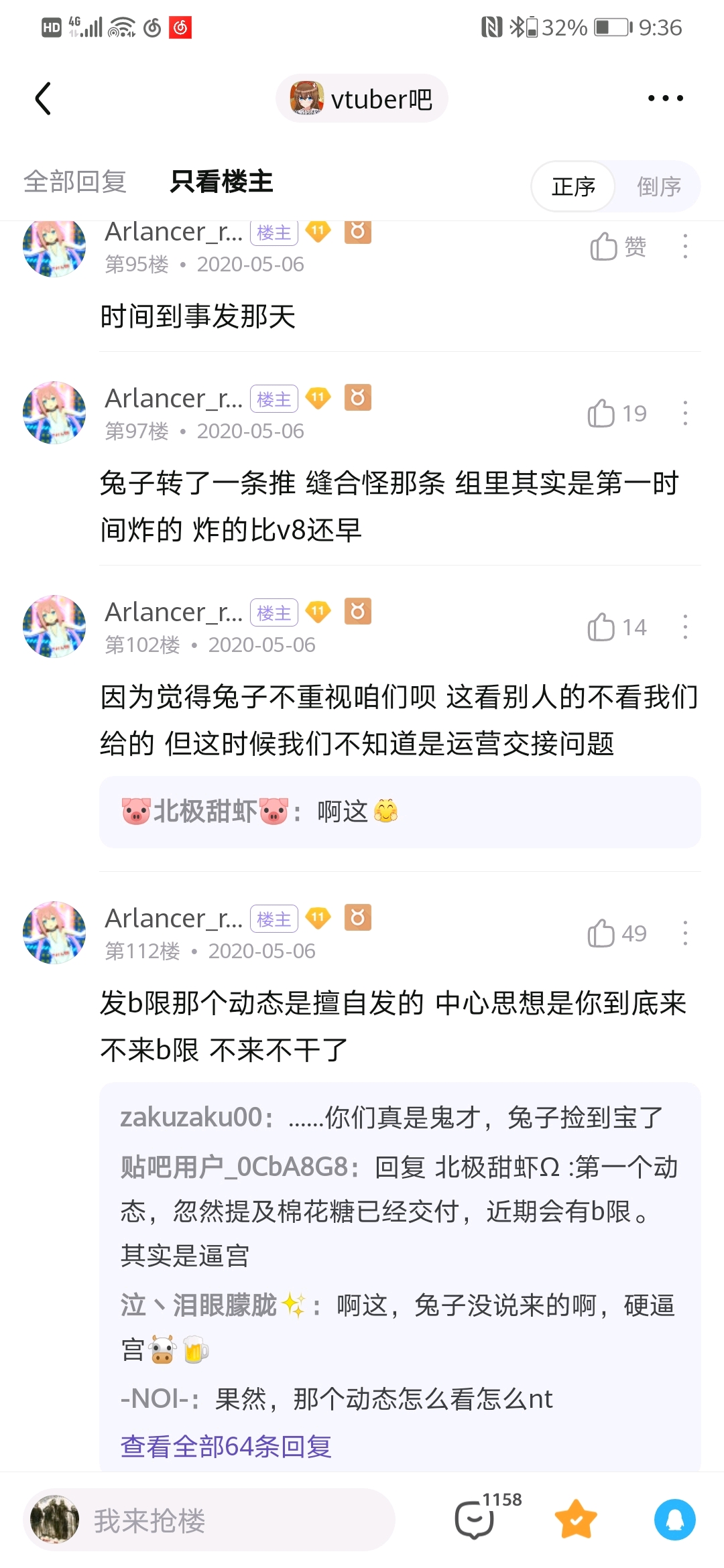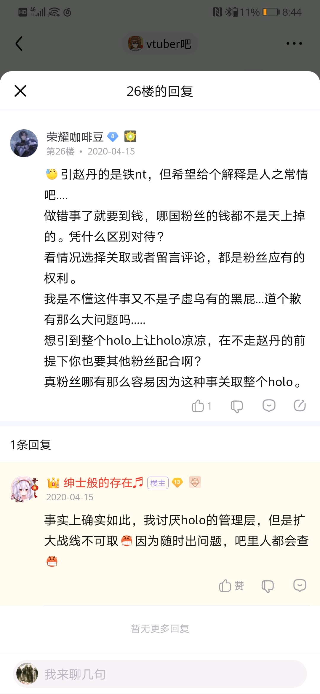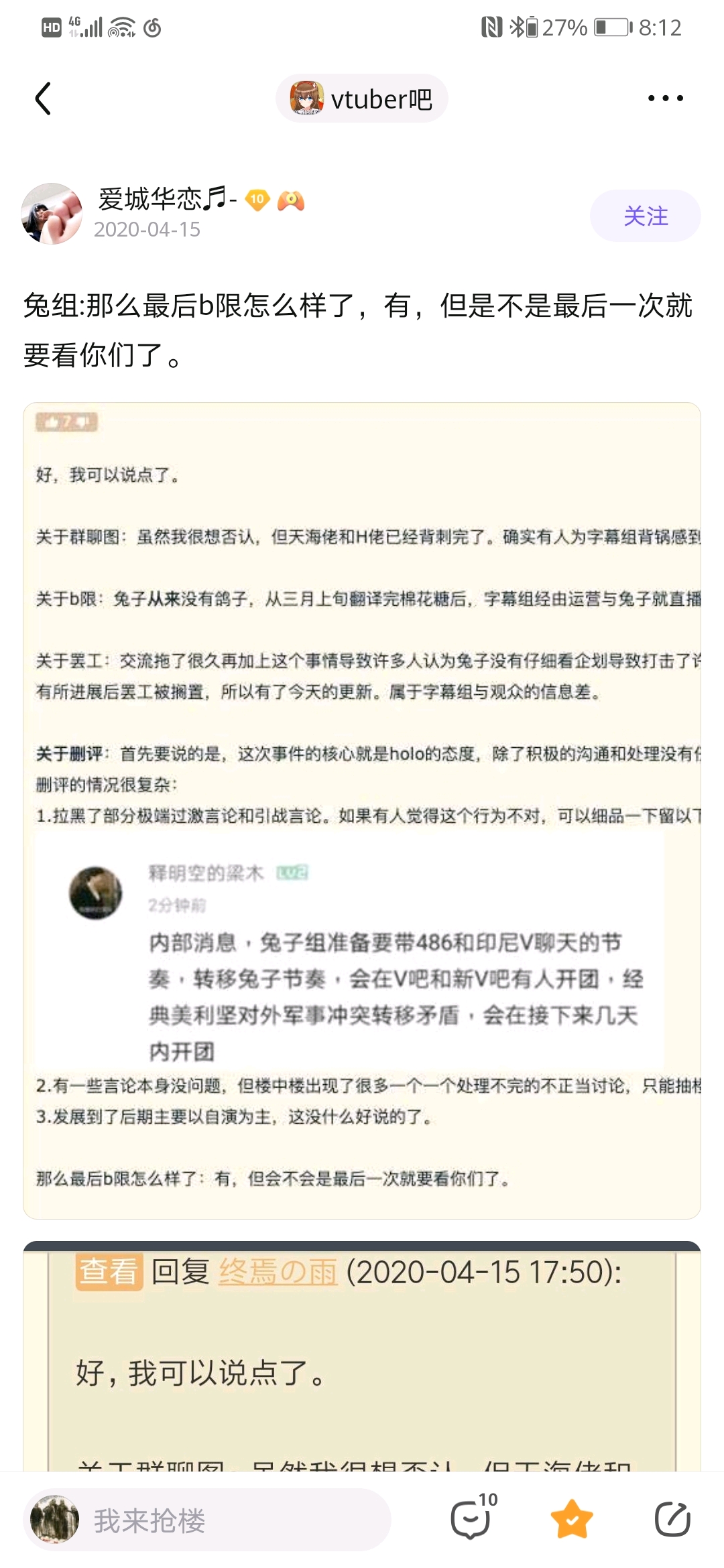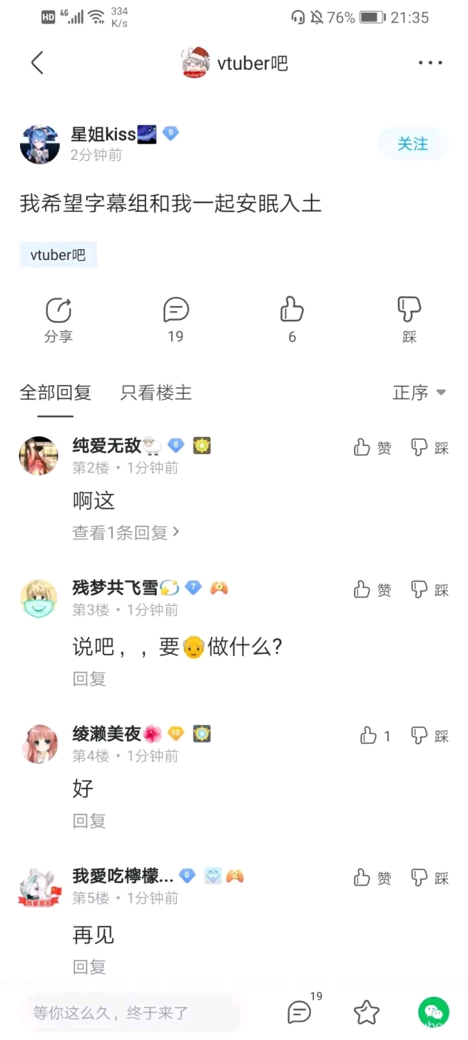 大概天狗楼落成没多久后开始看的nga和Vtuber吧。Vtuber吧当时给我的感觉就是比较冷清,尝试发了个贴也莫名其妙被吧务删了,而且贴吧的这个楼层系统又比nga爬楼麻烦。直到爆炸前夕大概是1月才开始逐渐看Vtuber吧。