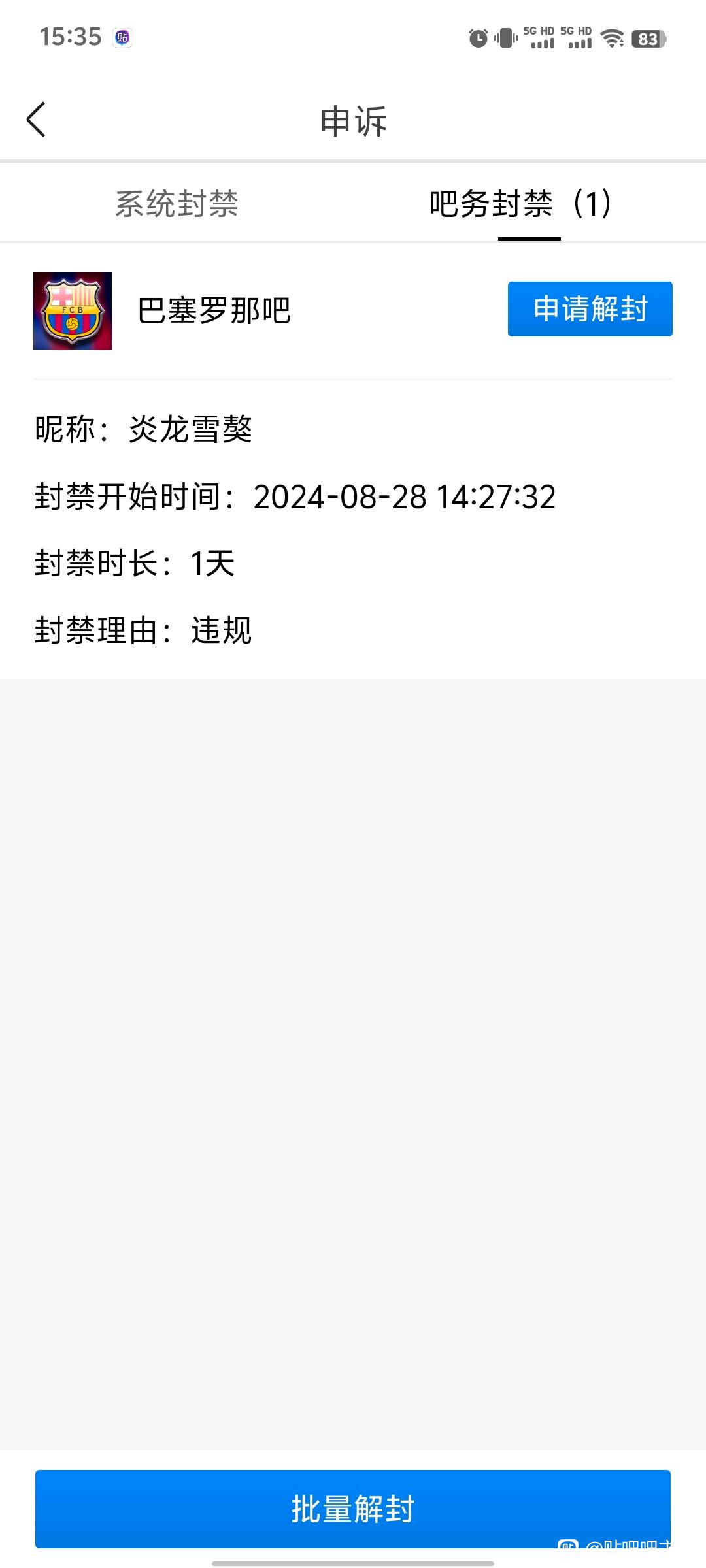 1楼pid:1508549967302024/08/29 18:52:09炎龙雪獒荒年 楼主 4级 巴塞罗那吧主违规封禁我账号,近15天我在巴塞罗那吧没有任何操作的情况下,该吧主先以我违规二字封我10天账号,接下来每天都封我1天账号,投诉巴塞罗吧吧主违规的问题。
