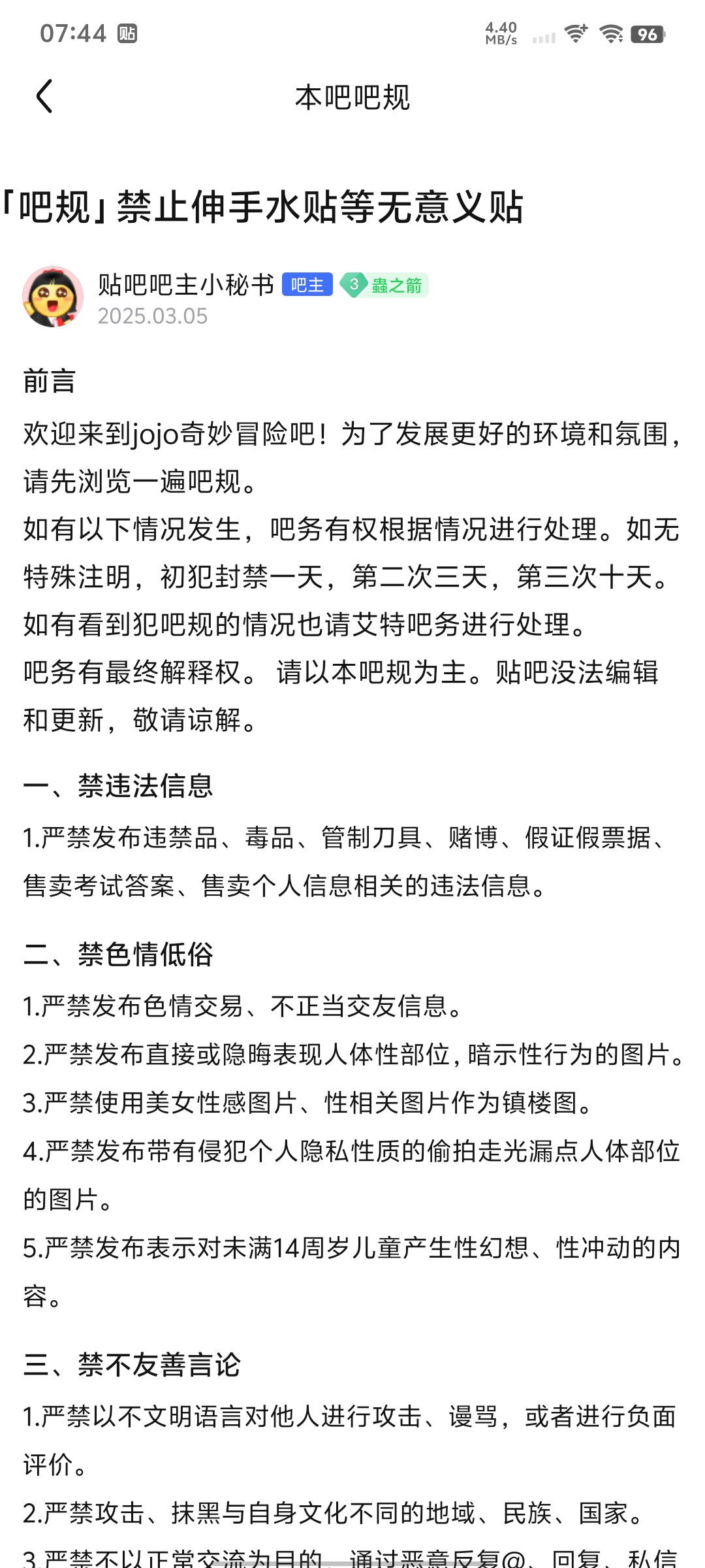 贴吧意见反馈吧 吐槽在JO吧发了个表情被10天tid:98199657792025/06/25 08:00:14212028 9 0楼主:黄大苟 色勤狂最后回复:平栗智未2026/01/21 21:38:521楼pid:1522861057042025/06/25 08:00:14黄大苟色勤狂 楼主 5级 先给自己一巴掌我的错,我的问题,我不该发表情的,有话就直接说我不知道那边吧务大爷,不喜欢“”这个表情我没有恶意的,我想表达的是这个帖子内容不错,我很期待,请再接再励的意思2楼pid:1522861073282025/06/25 08:00:55黄大苟色勤狂 楼主 5级 原帖链接AI作图之JOJO3楼pid:1522861085162025/06/25 08:01:24黄大苟色勤狂 楼主 5级 我的回复4楼pid:1522861165282025/06/25 08:04:39黄大苟色勤狂 楼主 5级 被通知封禁恢复了我才发现我被禁了10天5楼4条pid:1522861369992025/06/25 08:12:52黄大苟色勤狂 楼主 5级 那边的吧规关键信息①初犯1天,二犯三天,三番10天而我算是在那个贴的第一次回复②关于无意义的内容我确实是想参与到讨论中,不过我不是很想说太多的话,就用了一个表情来回复,用来支持楼主发出的内容,我觉得很不错好吧,定义我违禁了 念在我是初犯的话,不应该是给我一天吗,这是不是某人在滥用职权?擅自封禁_zhuozi100 桌子_7级 别人给你10天是因为没SVIP,要不然直接90天了。一个人多少天都只算一个无理由禁言我进去看了下,果然没有VIP。黄大苟 色勤狂 楼主 层主 5级 回复 桌子_ :回复 桌子_ :6楼pid:1522861389352025/06/25 08:13:36黄大苟色勤狂 楼主 5级 我的申述7楼pid:1522861450722025/06/25 08:15:56黄大苟色勤狂 楼主 5级 那要是一切都没有什么问题我就只能得出一个结论了那边发“”表情是很严重的,会被封10天可惜吧规上也没写啊,哦吧规吧务有最终解释权啊恕我冒昧了但这样的话,没有什么统一的标准的话,岂不是容易导致很多人不知道规则而被封呢?8楼pid:1522861545812025/06/25 08:19:33黄大苟色勤狂 楼主 5级 一个表情删就删嘛,封十天是跟我有仇吗,还是那天心情不好,那我开到9楼pid:1522861683852025/06/25 08:24:43黄大苟色勤狂 楼主 5级 搞笑的是贴吧系统把这个表情以xx利益删除就算了,我知道他没脑子,不分青红皂白,你一个活人,以不清不楚的理由删除,居然还封禁是不是有点太内个了10楼pid:1522861750372025/06/25 08:27:09黄大苟色勤狂 楼主 5级 我很好奇是哪位能人志士,卑微恳请他,解答我这个问题11楼pid:1522861899702025/06/25 08:32:33黄大苟色勤狂 楼主 5级 JOJO啊 以前觉得画风奇怪,以及不少人在玩烂梗,而一直没看当我不在意画风,觉得没什么番剧看后而去选择jo系列发现意外的很不错 要热血有热血,要悬疑有悬疑,剧情跌宕起伏,人物帅气,等等都非常的优秀我还是从第一部开始看,好像是三天吧,补完了全系列番剧,不信的话可以和我连麦,大致剧情我还记住吧12楼3条pid:1522922577502025/06/26 15:42:09邪婴星瞳星瞳公主12级 黄大苟 色勤狂 楼主 5级 vivo50邪婴星瞳 星瞳公主 层主 12级 回复 色勤狂 :这是手机吗黄大苟 色勤狂 楼主 5级 回复 星瞳公主 :broの知识本当に上手です13楼1条pid:1524217235782025/07/25 22:33:43RKHYM2哈气诗可爱捏1级 黄大苟 色勤狂 楼主 5级 14楼pid:1524220386302025/07/25 23:51:03waifdbld36789衛AI蕟大歩烮颠an7级 贴吧的名声和生态就是被这些鸡毛吧务搞坏的15楼pid:1531163330172026/01/21 21:38:52平栗智未余支鑫深愛麻瑞清1级 神奇的吧务