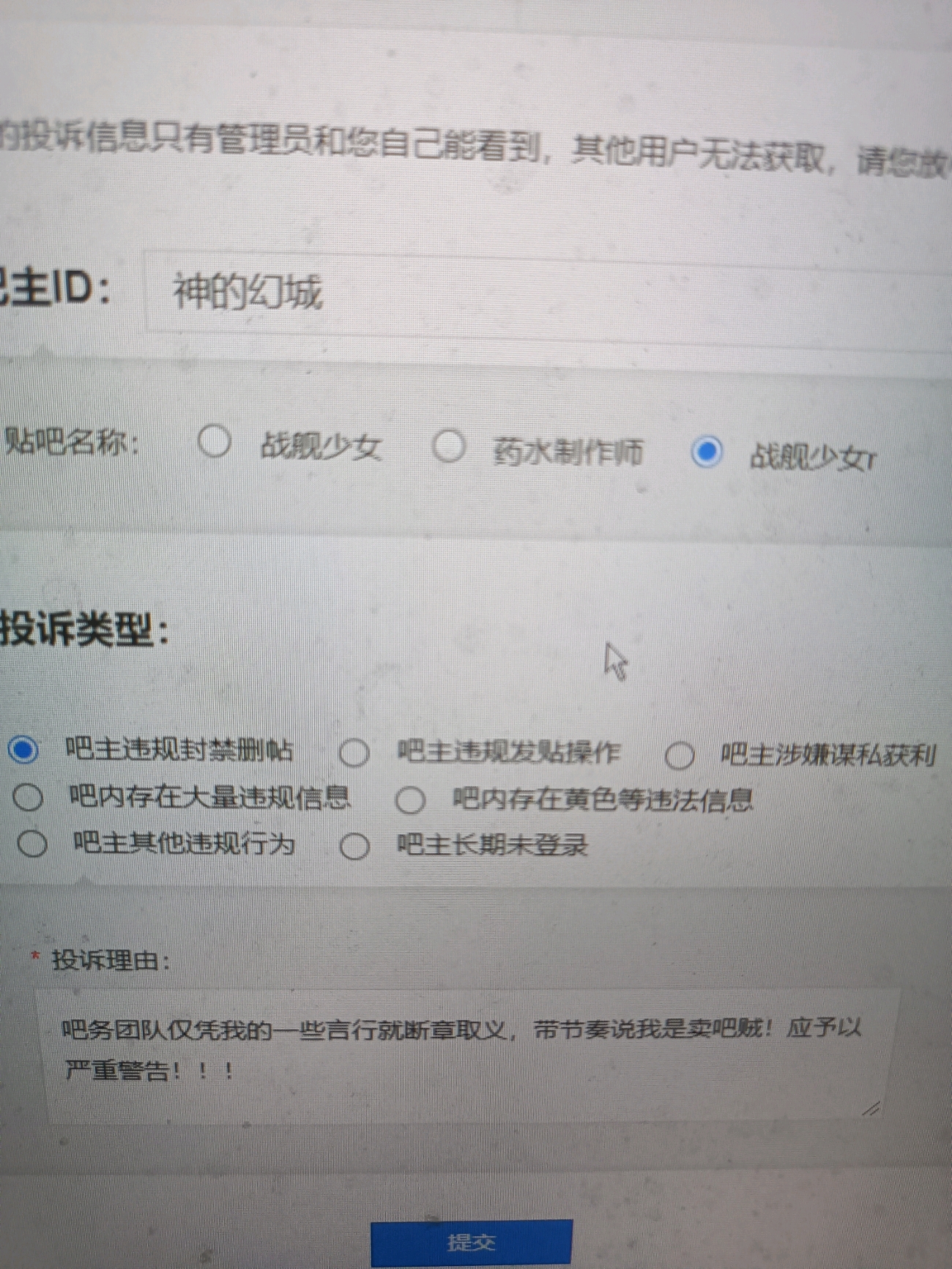 吧友您好,关于吧主及其吧务团队违规举报请收集充分的证据至官方指定渠道——吧主投诉中心(